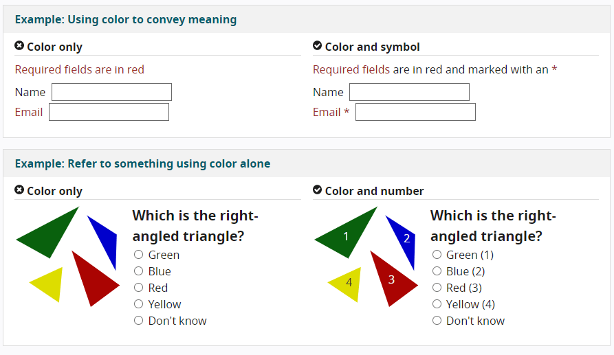 Another navigational consideration is interactivity and the ease of user engagement. This is important not only for those with disabilities, but for usability in general—especially on small screens. Links, buttons, and other interactive elements should be easy to identify, with consistent naming, styling, interactive feedback, and positioning used consistently across the site. Also, avoid color combinations (such as red and green) that are difficult for the more than 8% of the population with color blindness to distinguish between. Instead of conveying information through color alone, clarify elements using combinations of color, text, labels, and iconography in your interactive design.