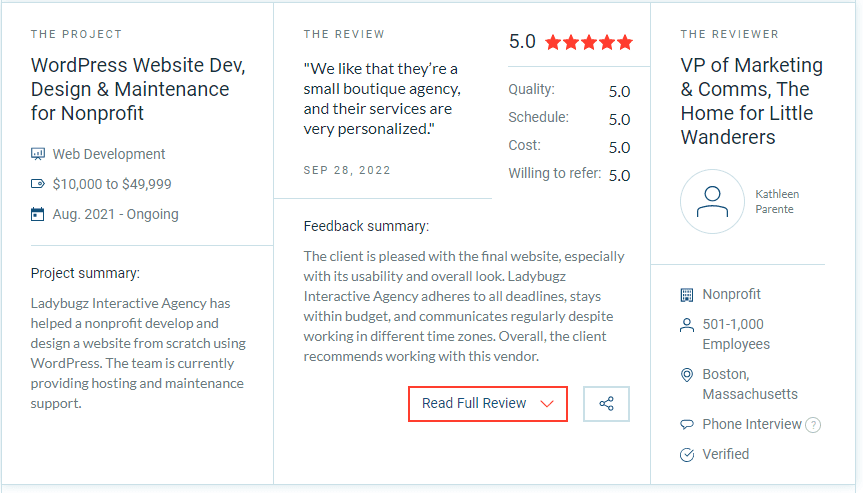 The bottom line is that becoming a successful five-star rated web design agency requires meeting all three goals. Evidence that Ladybugz fulfills its clients’ needs are the top scores we receive on Clutch, a B2B platform that creates performance rankings for companies by industry. The rankings, which go up to five, are based on customer reviews. This makes them especially valuable as a tactic for visibility and proof of our agency’s expertise.