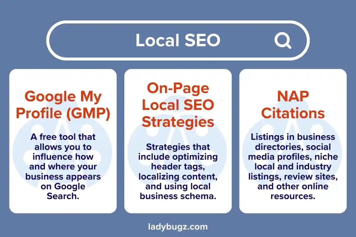 Google will rank for local search signals from many sources, including on-site relevance and quality, online review and reputation, local backline and citations, and user engagement factors. Two essential local search strategies that create backlinks are Google My Profile (GMP) and NAP (Name-Address-Phone) citations.